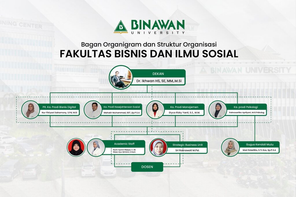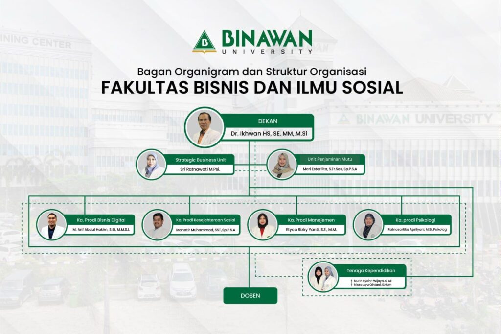 Struktur organisasi FBIS dirancang untuk mendukung efektivitas pengelolaan pendidikan, penelitian, dan pengabdian masyarakat. Setiap posisi memiliki peran strategis dalam mencapai visi fakultas menjadi yang terdepan dalam bidang bisnis dan ilmu sosial.